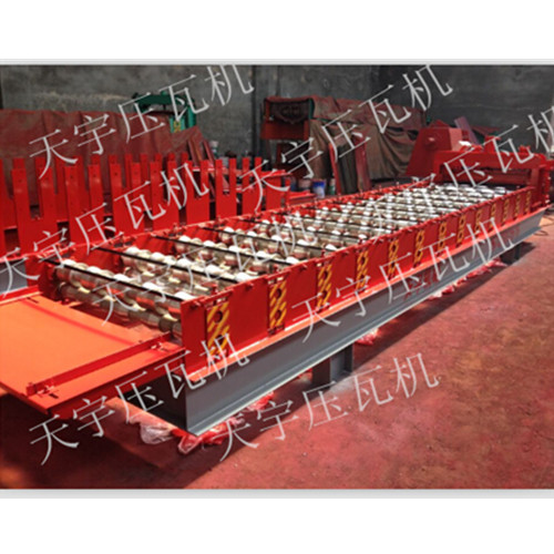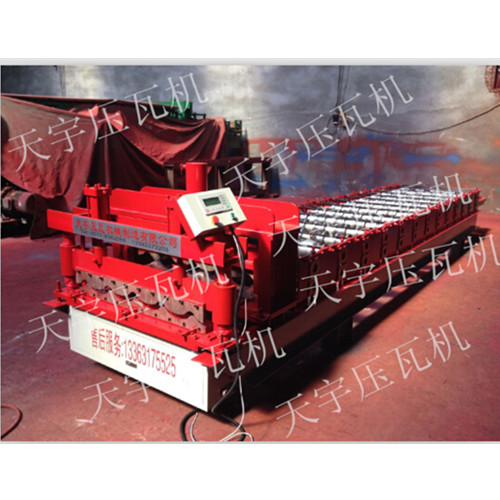 新型竹筒琉璃瓦設(shè)備生產(chǎn)過程如下:彩色鋼板進(jìn)入輥道成型部分,成型后到壓型部分,壓成等距離一節(jié)一節(jié)的,切刀負(fù)責(zé)定長(zhǎng)切割。